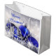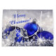 Elegant Christmas and New Year silver gift bag with blue Christmas baubles, white sparkling lights, shiny tinsel and a space for your text.
