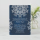 A beautiful DARK BLUE NAVY AND SAPPHIRE JEWEL TONE and faux silver look wedding invitation with an exotic Indian inspired ornamental sari MEDALLION pattern WITH A FLORAL AND LOTUS SUNBURST DESIGN. This elegant and beautiful modern Indian style wedding invite is perfect for any formal occasion WITH AN EAST ASIAN INDONESIAN MOROCCAN ALADDIN OR ARABIAN NIGHTS THEME. Designed by Chrissy H. Studios, LLC. All Rights Reserved.