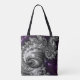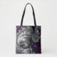 Complex fractal patterns emerge from a swirling black and white sphere, set against a rich purple background. The design invokes a sense of infinite complexity and mesmerizing depth reminiscent of cosmic phenomena.