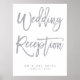 Silver and white wedding reception sign print with silver sequins effect (faux, printed as an image) and customisable text - you can add bride's and groom's name and wedding date. Dimensions of the sign print (poster) are 18 inches by 24 inches.