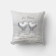 Throw pillow with my silver coloured computer artwork of two silver hearts floating on water. Customisable text says "25 Years".