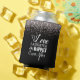 This adorable custom wedding features the phrase "To Love, Laughter, and Happily Ever After". Customise the other side with your initials, names, and wedding date. Perfect for a wedding party or reception. Background design matches our Silver and Black Hollywood Glitz and Glam wedding collection with a black background and silver sparkles raining down.