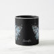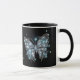 This beautiful mug has an image of a glittery silver and blue fantasy butterfly. Around the butterfly are shining silver stars, and everything is placed on a dramatic black background. The image is repeated twice on the mug, with your name in silver between them.