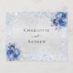 A faux silver looking background, decorated with light blue faux sparkles and blue florals, flowers. Personalise and add the reply by date and your names.