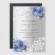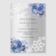 For an elegant and romantic wedding. A faux silver looking background decorated with blue florals, roses and white lace. Personalise and add your names and details.