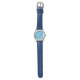 Round silver women's wristwatch with blue wrist band & blue face.