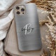 This elegant personalized phone case features a monogram and first name in modern black and white script on a trendy silver brushed metal background.
