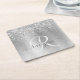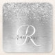 Silver Brushed Metal Glitter Monogram Name Square Paper Coaster