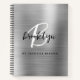 This personalised recipe notebook features a monogram and first name in modern black and white script on a silver faux brushed metal background, with the additional text in black sans serif font below.