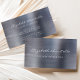 This elegant modern business card features a background image of silver faux brushed metal foil. Personalise it with your name in white handwriting-style script and business information in white sans serif font. The silver brushed metal image is repeated on the reverse.