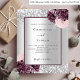 Faux silver looking background decorated with burgundy and pink florals, flowers and faux silver glitter, sparkles. Personalise and add your names and wedding details. Black letters.