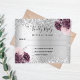 A faux silver metallic looking background, decorated with sparkling faux glitter and burgundy and pink florals. Personalise and add the reply by date and your names.