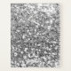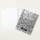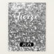 A modern bold name in white with a black drop shadow on a blank planner. The font size, colour and style are customisable. decrease the font size for longer names. The black shape behind the year can be customised. The background is a faux silver confetti or sequin glitter with sparkly spots or blurry bokeh.
