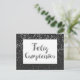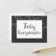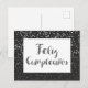 Modern Spanish birthday postcard with a silver and black confetti background and Feliz Cumpleanos in a silver glitter design. Please note there is not actual glitter, but a glitter design effect.