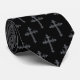 Silver crucifixes on a black tie create a striking and elegant contrast, blending religious symbolism with formal attire. The silver crucifix, often a symbol of Christianity, stands out prominently against the deep black background of the tie.