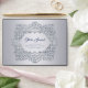 This envelope design shines with timeless sophistication, featuring a soft silver-grey background beautifully adorned with an ornate silver damask frame. The intricate swirls and floral motifs sparkle with a subtle glitter-like effect, giving the design a refined yet glamourous character. The central text area stands out elegantly, making the envelope ideal for adding a luxurious touch to any occasion.