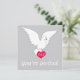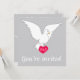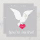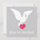 This gorgeous wedding invitation features a white dove on a gorgeous silverbackground which is a lovely look for a wedding. The dove is also holding onto a red love heard which has initials in it which can be customised to be the bride and groom's initials and is a romantic touch to the front of the invitation. The back of the invite is a simple silver coloured background with all the details of the happy event in white writing.