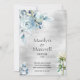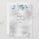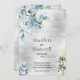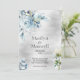 A modern and elegant watercolor painted wedding invitation featuring a bouquet of dusty blue peony blossoms against a silver watercolor wash background with a lively slender serif font.