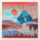 A beautiful abstract landscape design with mountain and forest scene and an eagle landing on a tree in vibrant shades of blue, cyan, silver, and crimson.