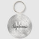 This chic keychain features a pattern of faux glitter diamond confetti on a silver faux foil background. Personalise it with your initial in white serif font and your name in charcoal grey handwriting-style brush script.