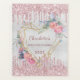 A faux silver looking background. Blush pink faux glitter drips, paint dripping look as decoration. A golden heart decorated with pink flowers. Personalise and add a name and year. The name is written with a modern hand lettered script.