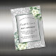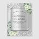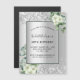 A stylish birthday invitation magnet. Faux silver looking background decorated with white florals, flowers, eucalyptus greenery and faux silver glitter, sparkles. Personalise and add your name and party details. Black letters.