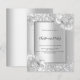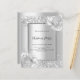 Faux silver looking background decorated with florals, flowers and faux silver glitter, sparkles. Personalise and add your party details. Black letters.