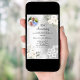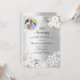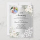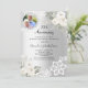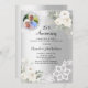 For an elegant and romantic 25th wedding anniversary. A faux silver looking background decorated with white florals, roses and white lace. Personalise and add your photo, names and details.