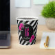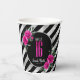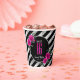 Celebrate in style with this unique Sweet Sixteen paper cup design featuring a large, faux foil 'Sweet 16' in silver and hot pink. The solid black background is topped with diagonal stripes in the same silver foil effect with lush hot pink roses around an oval frame. If preferred, the eye-catching 'Sweet 16' is optional and can be deleted to use this template for other occasions. Use the provided template to customise your name and birthdate. Search ID759 to see other products and colour options for this design.
