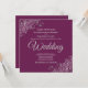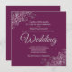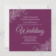 These beautiful wedding invitations feature a design that is simple, sophisticated, chic, traditional and modern all at once. The text is grey, with lacy silver faux foil filigree or floral frills in the corners on a magenta or cassis purple background. Perfect for either a formal or modern ceremony.