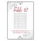 These beautiful table number cards feature a simple yet elegant design with red script calligraphy on a white background with a frilly silver faux foil floral filigree in the corners. Each card has room for the names of 10 guests so they also function as a seating chart making it easy for people to find their tables at your wedding reception.