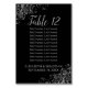 These beautiful table number cards feature a simple yet elegant design with light grey script calligraphy on a black background with a frilly silver faux foil floral filigree in the corners. Each card has room for the names of 10 guests so they also function as a seating chart making it easy for people to find their tables at your wedding reception.