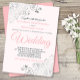 This wedding invitation features a simple yet elegant design with pink and grey script lettering on a white background. The simplicity of the design is offset by the silver faux foil frills in the corners. The fancy filigree is ornate and floral and provides a nice contrast with the understated text. The wording is formal and traditional, but the chic layout makes it look modern and accessible.