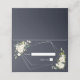 Modern and trendy, this place card features a faux silver foil geometric embellished with watercolor eucalyptus greenery and white floral arrangements, on a modern navy blue background. Copyright Elegant Invites, all rights reserved.