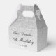 This beautiful favour box features faux glitter and your custom text. Use the template form the add your information. The "Customise Further" feature can be used to change the font and the text layout. You can also add text to the other side of the favour box.