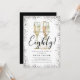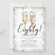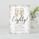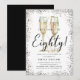 This is an elegant and chic 80th Birthday Party invitation featuring a silvery glitter border, a pair of watercolor champagne glasses and a modern script font. This would be perfect for anyone looking to celebrate their special milestone birthday in style.