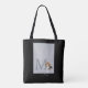 Silver glitter beagle puppy dog lover personalised name and initial monogram design. The tricolor beagle dog illustration has the cute beagle dog in the sitting position. Behind the pup is a capital letter, and at the puppy's paws is a name in a handwritten style. Both of these are in silver grey and are personizable to add your own name and initial. The backdrop to the design is a glittery shiny sparkly silver. On this bag the design is on the front and back, on one side it is against a white colour background and on the other against a black colour one. This pattern for her would appeal to all beagle lovers, beagle Moms, beagle Mums, beagle sisters, beagle friends, and all those who love beagle puppy dogs.