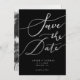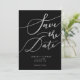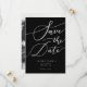 Elegant and simple wedding save the date card. The hand lettered typography text is in faux silver glitter on a black background.