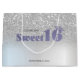 Modern chic and elegant silver glitter bokeh ombre with sweet 16 with a crown on a silver background.