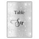 The table number is written with an elegant hand lettered style script. Black letters, a faux silver background with faux glitter dust, sparkles.
