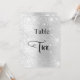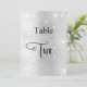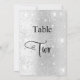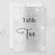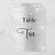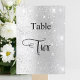 The table number is written with an elegant hand lettered style script. Black letters, a faux silver background with faux glitter dust, sparkles.