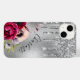 Faux silver glitter drip, paint dripping look on a faux silver metallic looking background. Burgundy, pink and rose gold coloured Flowers. Personalise and add a name. The name in black is written with a modern and trendy hand lettered style script.