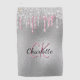 A faux silver metallic looking background decorated with pink and faux silver glitter drips, paint dripping look. Personalise and add a name, your monogram initials. The name is written with a hand lettered style script.
