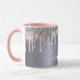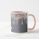 A girly and trendy monogrammed mug. A chic faux silver looking background decorated with pink and faux silver glitter drips, paint dripping look. Personalise and add a name and monogram letter. White and pink coloured letters. The name is written with a modern hand lettered style script with swashes. To keep the swashes only delete the sample name, leave the spaces or emoji's in front and after the name.