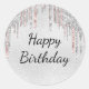 A girly and trendy sticker for a birthday gift. A faux siver metallic looking background decorated with pink faux glitter drips and the text: Happy Birthday in black.