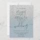 Grey silver glitter ombre blush script chic wedding with an elegant silver sparkles glitter ombre gradient on an editable dusty blue with an elegant and modern script calligraphy.