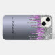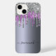 An elegant, girly and glam case. Faux silver and purple faux glitter drip, paint dripping look. Chic dark faux silver metal looking background. Personalise and add your name. The name is written with a modern hand lettered style script. Black letters. To keep the swashes only delete the sample name, leave the spaces or emoji's in front and after the name