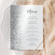 The left-hand edge of this elegant modern wedding menu features a faux silver glitter border. The customisable text combines grey handwriting script and sans serif font on a white background. The reverse side features a matching white and silver glitter design.