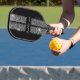 Personalised Custom-Designed Pickleball Paddle with Dark Gunmetal Silver Glitter Sport Racing Stripes and chic calligraphy script signature font name on a black background, with optional phone number contact information. Change the font and background colour to your favourites and never lose your spot at the court or confuse your paddle with anyone else's again! You will be the envy of the tournament with this chic and unique paddle design.