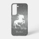Charge your electronic device with a Silver Glitter Unicorn Samsung Galaxy Case. Case design features a unicorn walking a star trail against a glitter background.